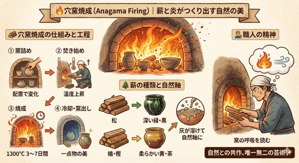 | ③ 焼成 | 約1300℃で3〜7日間焚き続ける | 炎と灰が釉薬を生む瞬間 |