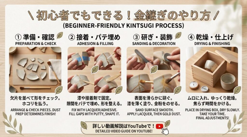 金継ぎは、難しそうに見えても、ひとつひとつの工程をゆっくり進めれば、初心者でも美しく仕上げられる伝統技法です🌿✨