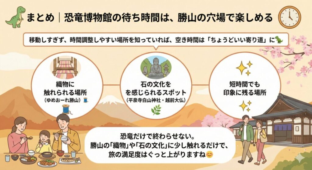 まとめ|恐竜博物館の待ち時間は、勝山の穴場で楽しめる