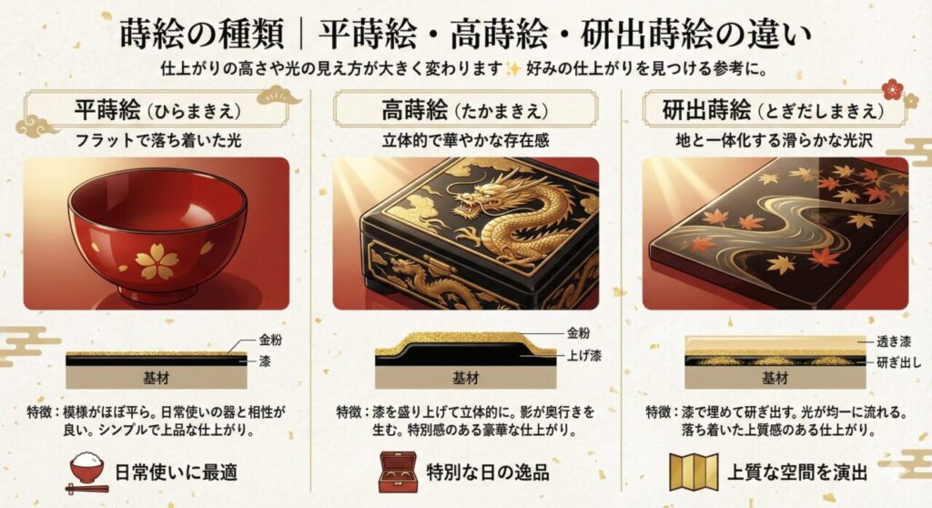 | 平蒔絵 | ほぼフラット | 落ち着いた光・上品さ | 箸・椀・日常使い |
